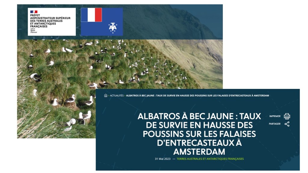 May 2023 : News article on the web pages of Terres Australes et Antarctiques Françaises about the research and conservation management activities implemented on Amsterdam Island where albatrosses are threatened by infectious diseases and brown rats.